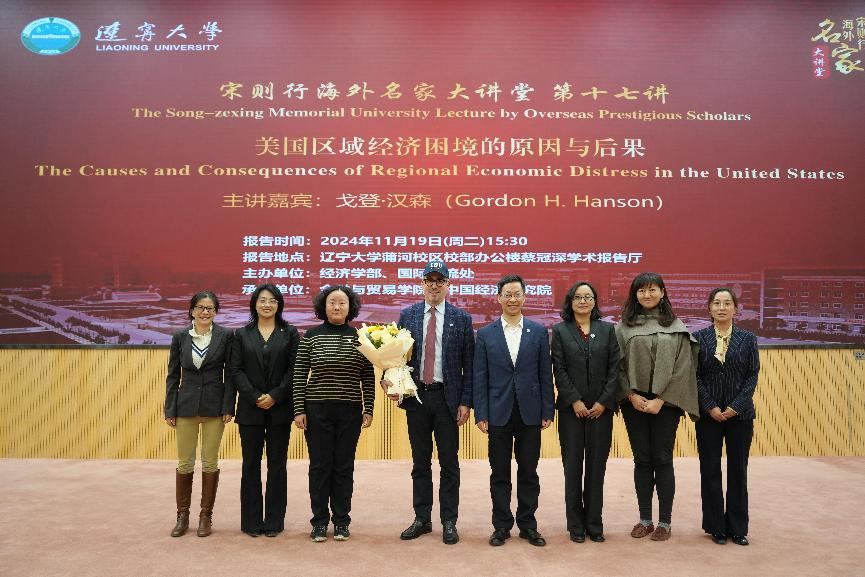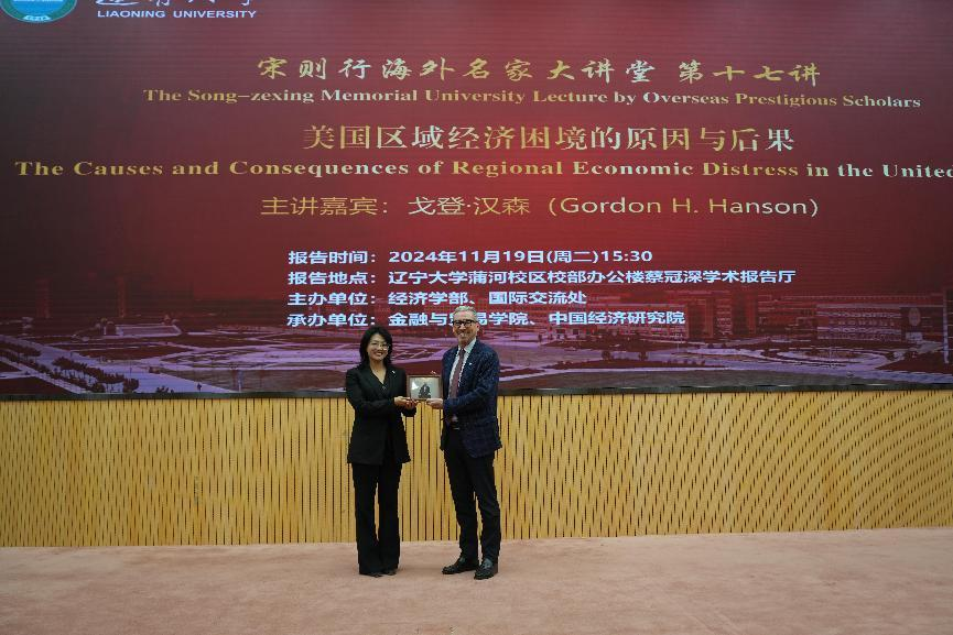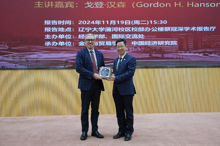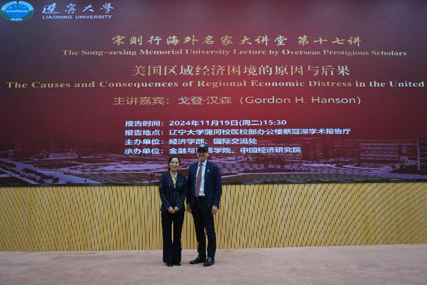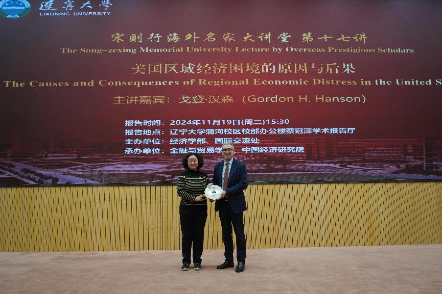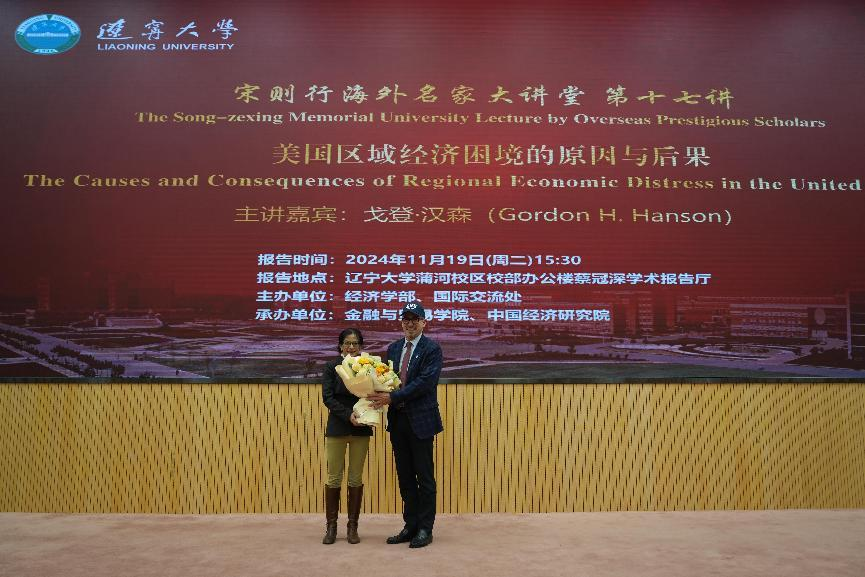 11月19日下午,beat365正版唯一官网必一宋则行海外名家大讲堂(第十七讲)在蒲河校区校部办公楼二楼蔡冠深学术报告厅举行。哈佛大学肯尼迪学院戈登汉森教授应邀作题为《美国地区经济困境的原因与后果》的学术报告。第十四届全国人大代表,辽宁省第十四届人大常委会委员,beat365正版唯一官网必一党委副书记、校长余淼杰出席报告会并致辞,副校长李宇鹏、仇焕广出席报告会,国际交流处处长谢名一、经济学部副主任王伟光、中国经济研究院副院长兼金融与贸易学院副院长马湘君、国际交流处副处长尹如玉、经济学部办公室主任孔晓参加报告会。报告会由仇焕广主持。