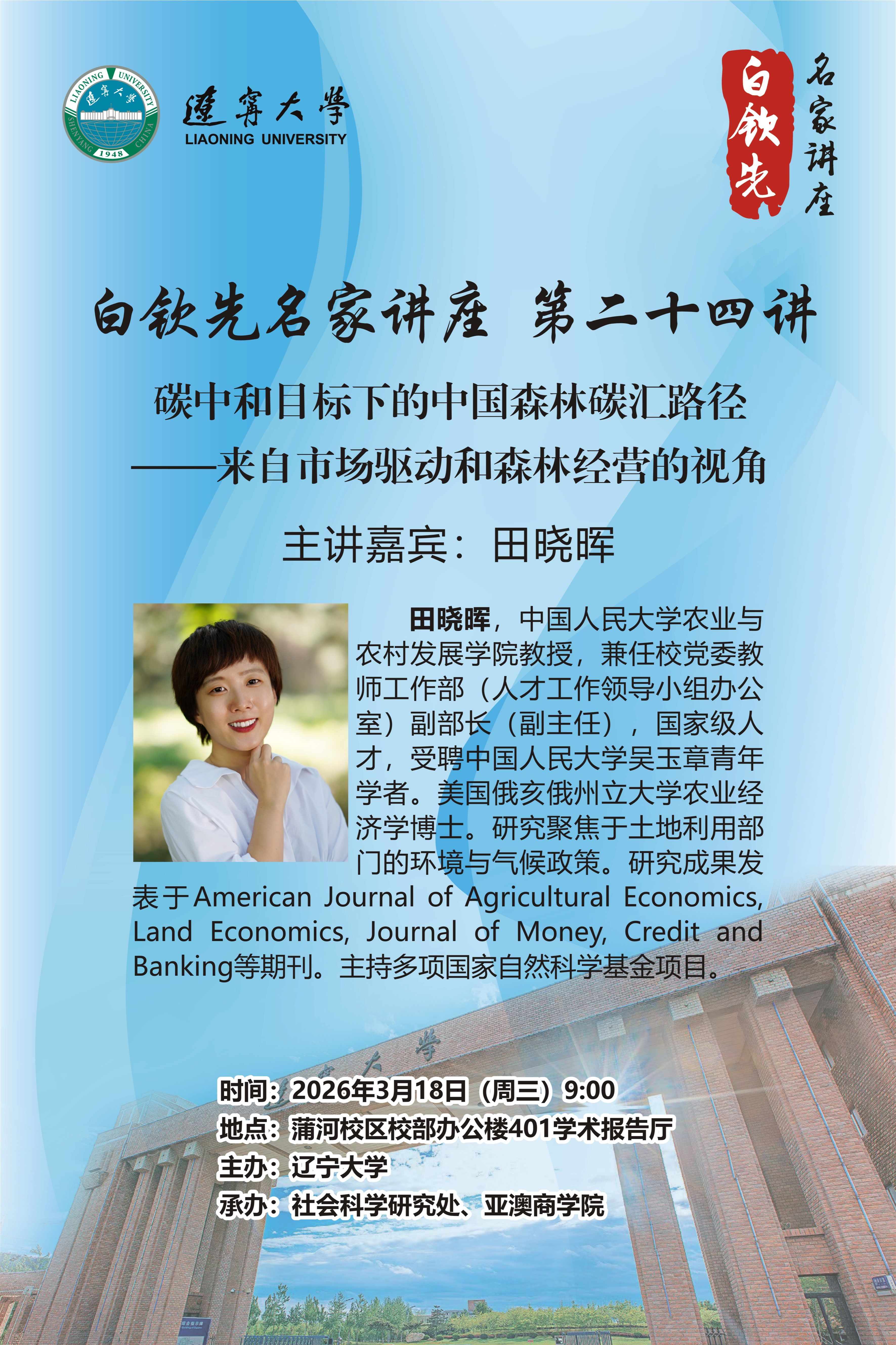 为持续建设高端学术交流平台,拓宽广大师生学术视野,学校瞄准科学发展前沿,同国际接轨,学校开设“白钦先名家讲座”,邀请国内外高学术水平经济类青年学者来校开展专题讲座。白钦先名家讲座第二十四讲将于3月18日(周三)9:00开讲,并邀请到了中国人民大学田晓晖教授作为主讲嘉宾,为师生们带来题为“碳中和目标下的中国森林碳汇路径——来自市场驱动和森林经营的视角”的学术讲座。