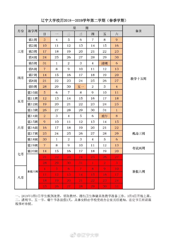 2018-2019学年第二学期(春季学期)校历