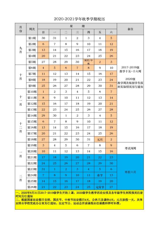 2020-2021学年第一学期(秋季学期)校历