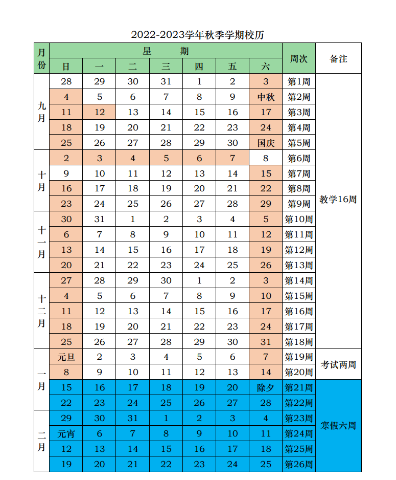 2022-2023学年第一学期(秋季学期)校历
