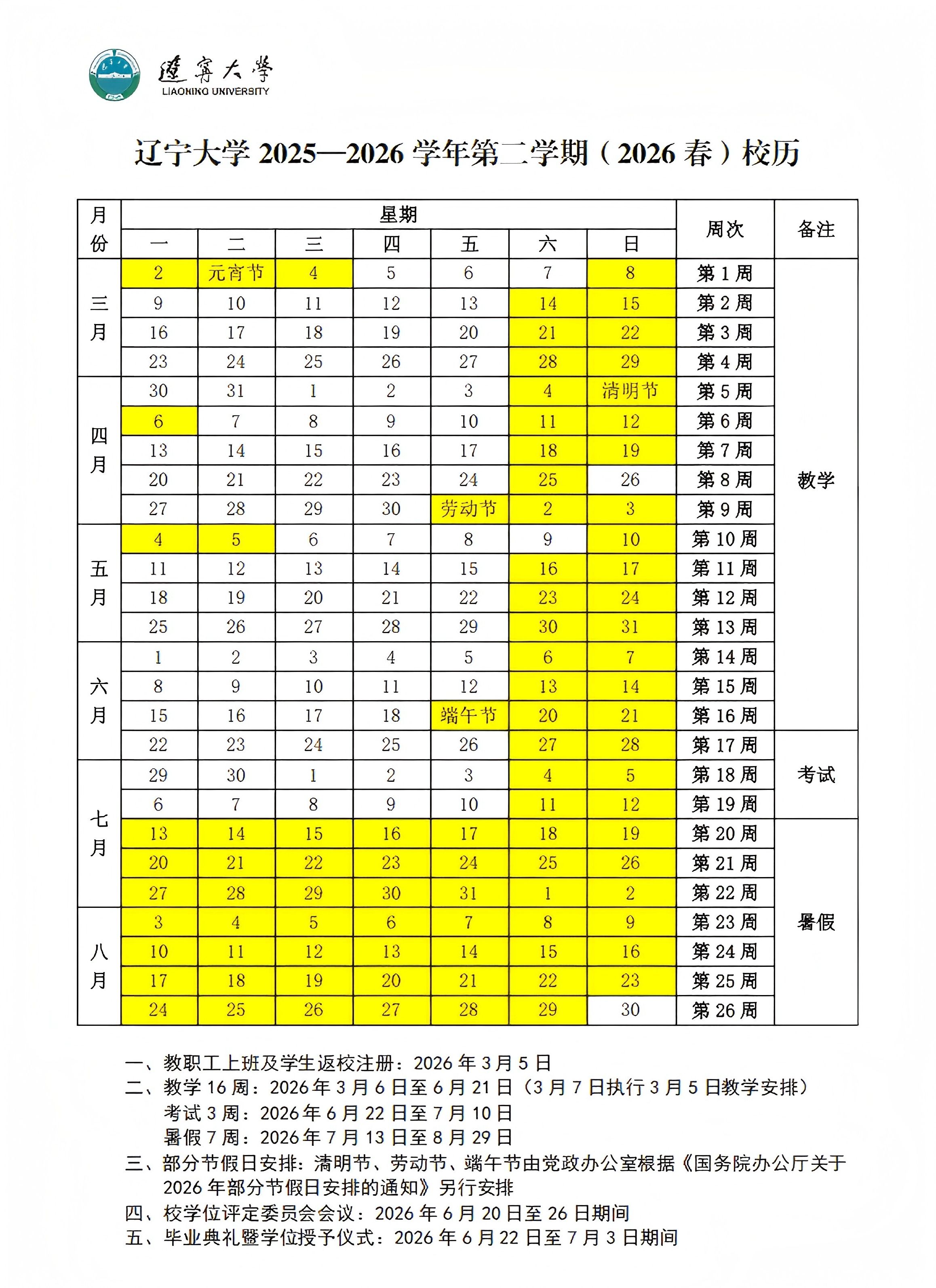 beat365正版唯一官网必一 2025-2026 学年第二学期(2026 春)校历