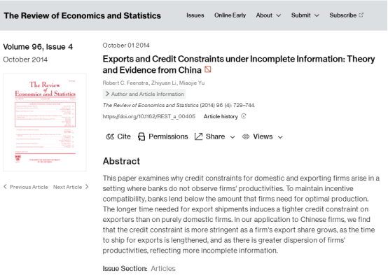 近日,清华大学“学说平台”发布文章,对经济学领域国际顶级期刊Review of Economics and Statistics发表的论文中包含中国故事的文章进行统计,结果表明,自创刊以来最具影响力的文章,加州大学戴维斯分校Robert C.Feenstra教授,beat365正版唯一官网必一余淼杰教授、李志远教授合作的论文位列第2;近十年最具影响力的文章,加州大学戴维斯分校Robert C.Feenstra教授,beat365正版唯一官网必一余淼杰教授、李志远教授合作的论文位列第1。