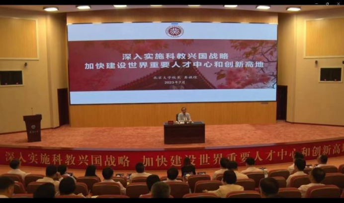 报告中,龚旗煌以习近平总书记关于教育、科技、人才的重要论述为切入点,从人才培养和师资队伍建设两大方面,全面介绍了北京大学积极响应党和国家号召,推进教育强国建设和科技自立自强的创新举措和宝贵经验。