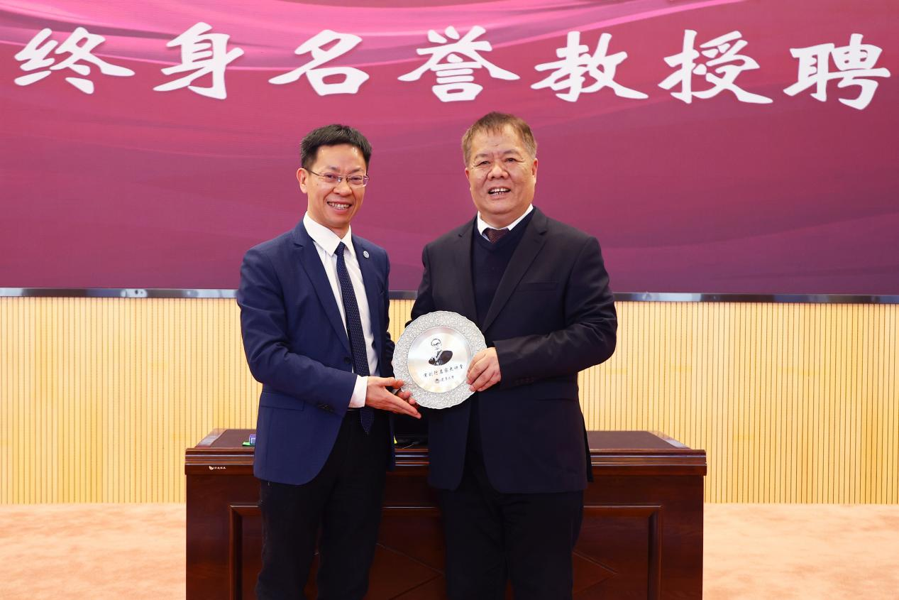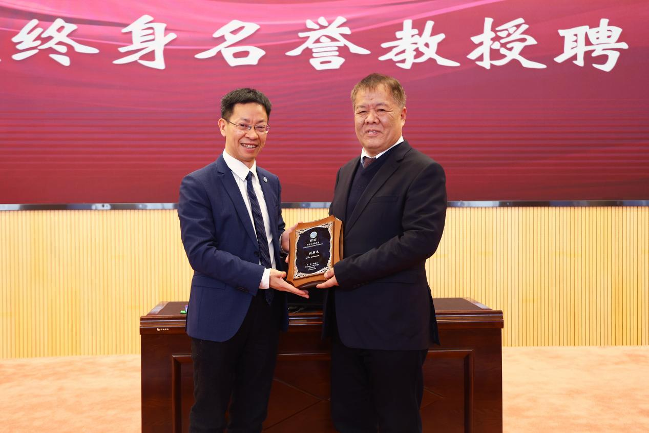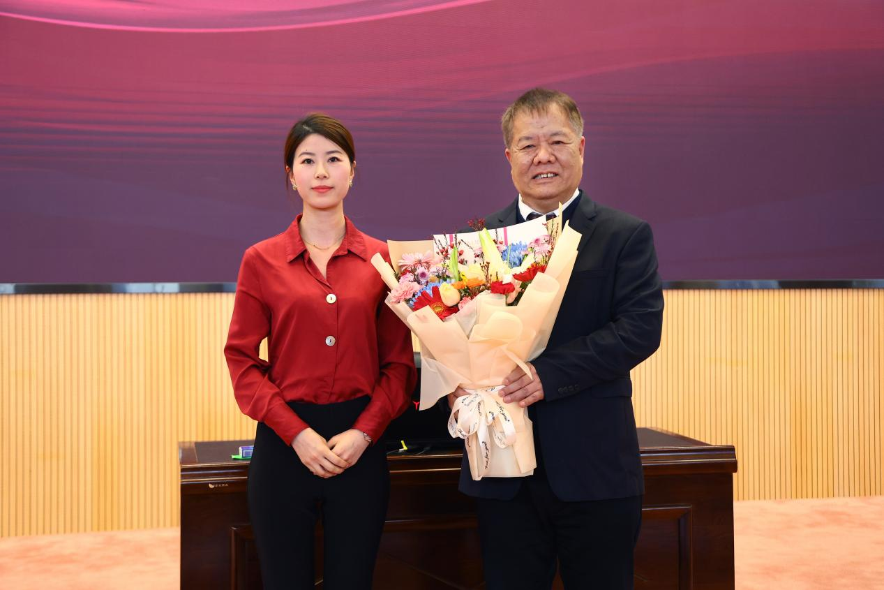 会议最后,beat365正版唯一官网必一党委副书记、校长余淼杰教授为刘新民教授颁发beat365正版唯一官网必一“宋则行名家大讲堂”纪念盘及beat365正版唯一官网必一终身名誉教授聘书。校医院教师关岩岩为刘新民教授献花,药学院教师代表桑育黎为刘新民教授佩戴校徽、赠送校帽,与会嘉宾一同合影留念。