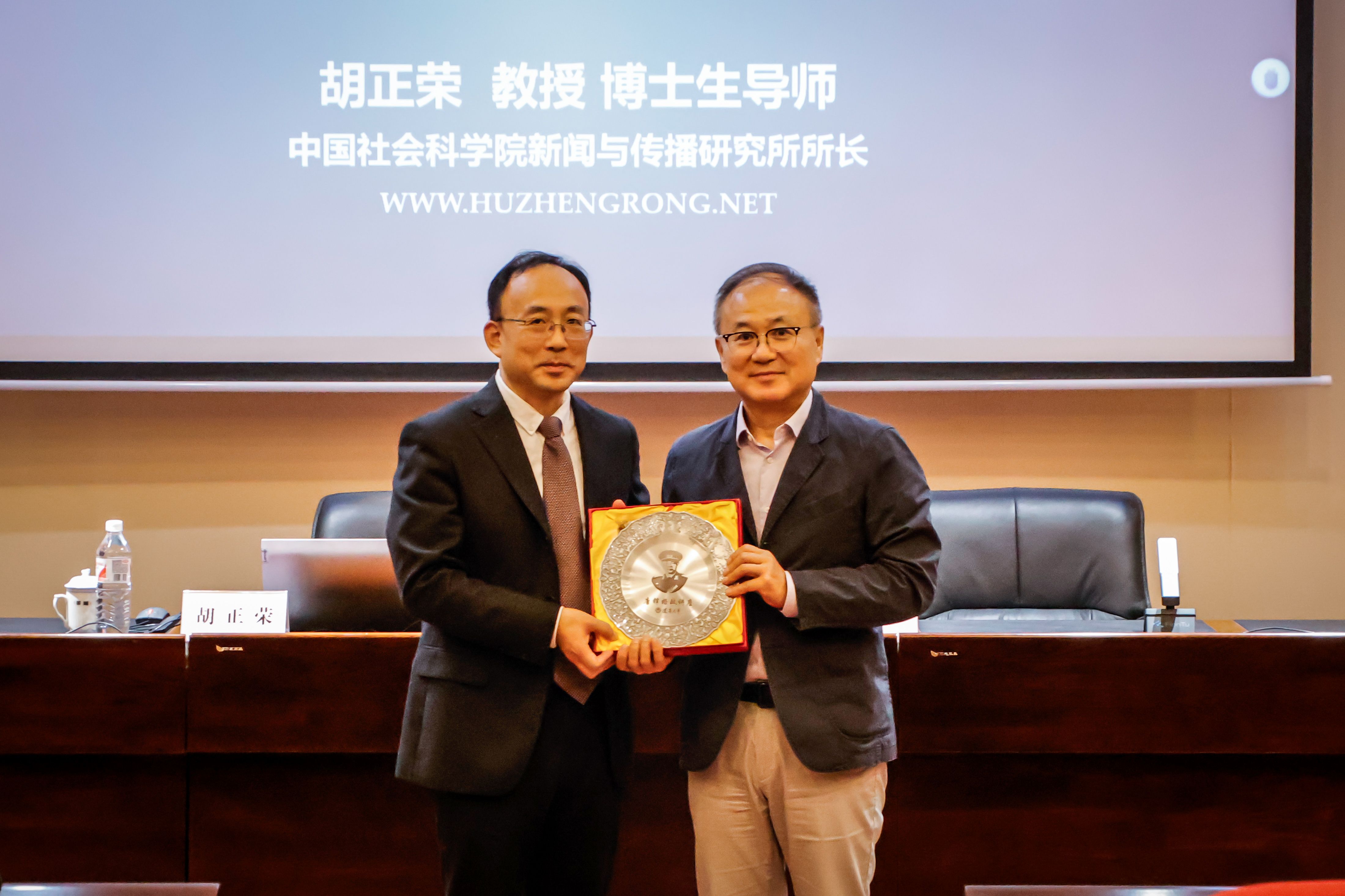 讲座结束后,仇焕广副校长为胡正荣教授颁发了“唐铎格政讲座”纪念证书和纪念盘,新闻与传播学院教师代表尹博向胡正荣教授献花致敬。新闻与传播学院师生代表100余人现场参加了讲座。