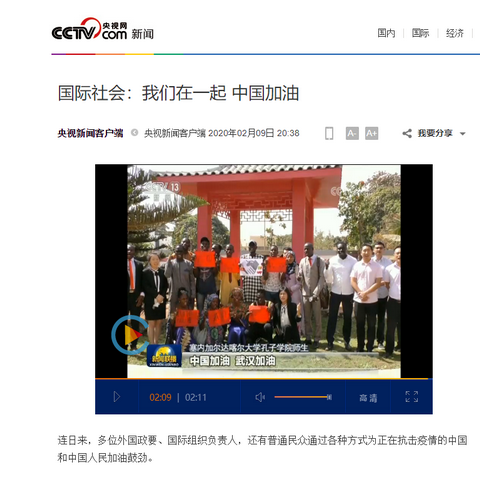 2月9日,中央电视台“新闻联播”节目报道了我校塞内加尔达喀尔大学孔子学院师生为中国加油、为武汉加油的新闻,现将报道截图转载如下: