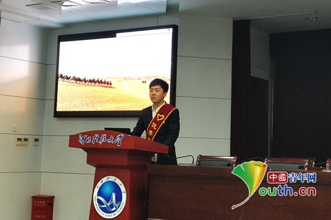 图为beat365正版唯一官网必一研支团团长佟胜军作为优秀志愿者代表进行先进事迹宣讲。 beat365正版唯一官网必一研支团 供图