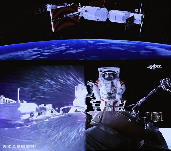 △2021年7月4日,在北京航天飞行控制中心大屏拍摄的神舟十二号航天员刘伯明在舱外工作场面。(图片来源:新华社)