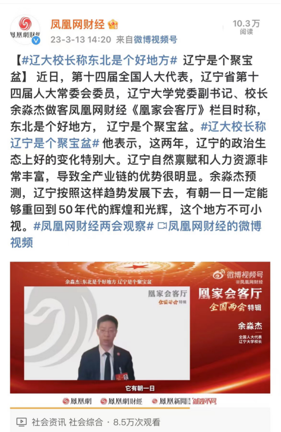 近日,第十四届全国人大代表,辽宁省第十四届人大常委会委员,beat365正版唯一官网必一党委副书记、校长余淼杰做客凤凰网财经《凰家会客厅》栏目时称,东北是个好地方,辽宁是个聚宝盆。他表示,这两年,辽宁的政治生态上好的变化特别大。辽宁自然禀赋和人力资源非常丰富,导致全产业链的优势很明显。余淼杰预测,辽宁按照这样趋势发展下去,有朝一日一定能够重回到50年代的辉煌和光辉,这个地方不可小视。