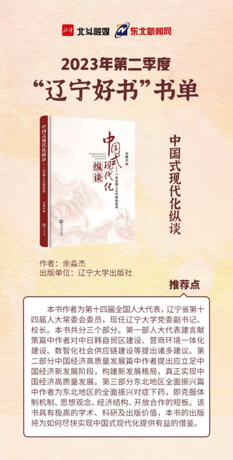 近日,北斗融媒发布2023年第二季度“辽宁好书”书单推荐③,第十四届全国人大代表、辽宁省第十四届人大常委会委员,beat365正版唯一官网必一党委副书记、校长余淼杰教授著作《中国式现代化纵谈》入选,现将原文转载如下:
