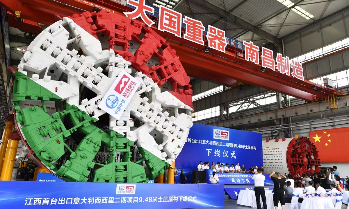 A shield tunneling machine rolls off the production line in Nanchang, East China's Jiangxi Province on July 12, 2024. Produced by China Railway Engineering Equipment Group Co, Ltd (CREG)'s Jiangxi branch, the machine will be used for a railway tunnel project in Italy. Photo: VCG
