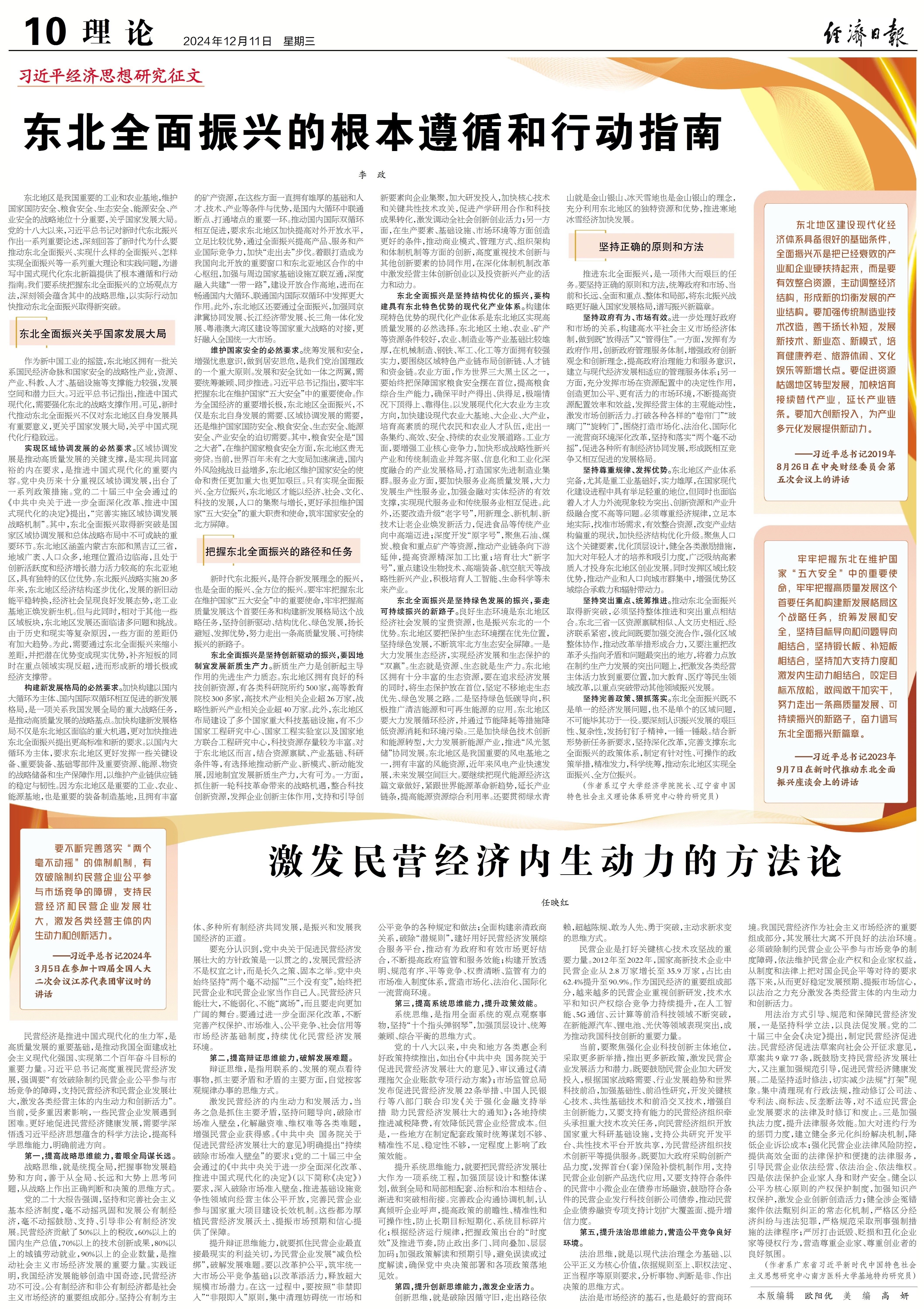 2024年12月11日,经济学院李政教授在《经济日报》理论版头条发表题为“东北全面振兴的根本遵循和行动指南”的文章。