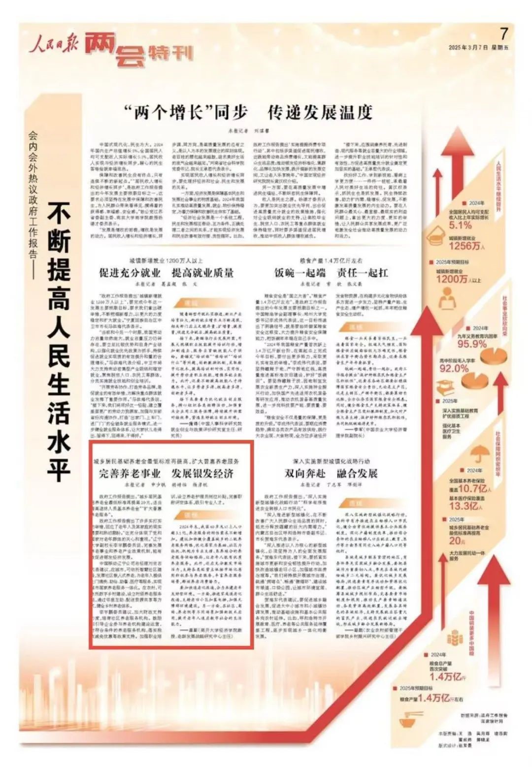政府工作报告提出,“城乡居民基础养老金最低标准再提高20元,适当提高退休人员基本养老金”“扩大普惠养老服务”。