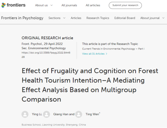 商学院李英教授课题组在康养旅游领域取得新进展,相关研究成果在国际学术期刊Frontiers in Psychology发表,文章题目为“Effect of Frugality and Cognition on Forest Health Tourism Intention – A Mediating Effect Analysis Based on Multigroup Comparison”。