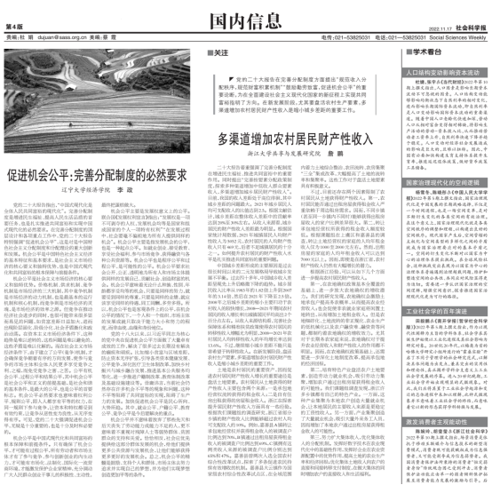 2022年11月17日,李政教授应约在《社会科学报》发表学习党的二十大精神收入分配专题文章,题为《促进机会公平:完善分配制度的必然要求》。