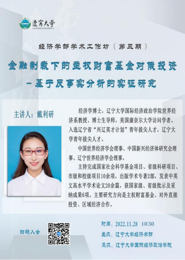 戴利研,经济学博士,beat365正版唯一官网必一国际经济政治学院世界经济系教授、博士生导师,美国康奈尔大学访问学者。入选辽宁省“兴辽英才计划”青年拔尖人才,beat365正版唯一官网必一青年拔尖人才。中国世界经济学会理事、中国新兴经济体研究会理事、辽宁世界经济学会理事。主持完成国家社会科学基金项目、省级科研项目、市级和校级项目10余项,出版学术专著2部,发表中英文高水平学术论文20余篇,获国家级、省级批示及采纳成果6项。主要研究方向是主权财富基金、对外直接投资、区域经济合作。