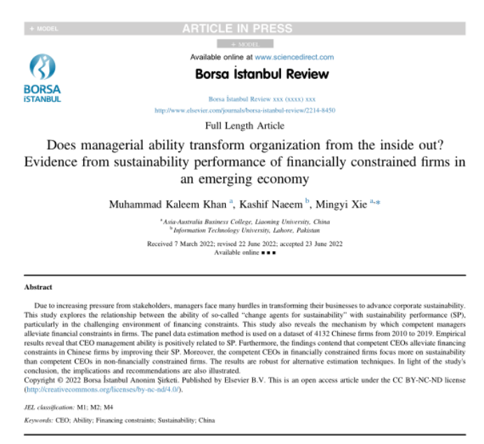 亚澳商学院Muhammad Kaleem Khan博士(第一作者)与谢名一教授(通讯作者)合作在Borsa Istanbul Review发表论文Does managerial ability transform organization from the inside out? Evidence from sustainability performance of financially constrained firms in an emerging economy。