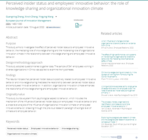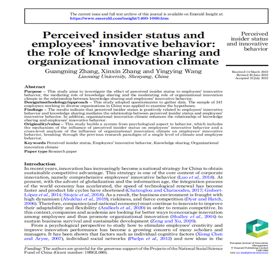 商学院张广宁教授作为第一作者与硕士研究生合作完成的论文“Perceived insider status and employees’ innovative behavior: the role of knowledge sharing and organizational innovation climate” 在《European Journal of Innovation Management》发表。