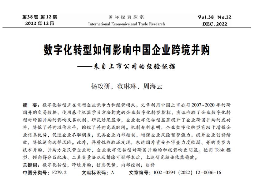 国际经济政治学院杨攻研教授(第一作者)与两位合作者共同完成的学术论文“数字化转型如何影响中国企业跨境并购——来自上市公司的经验证据”,在《国际经贸探索》2022年第12期发表。