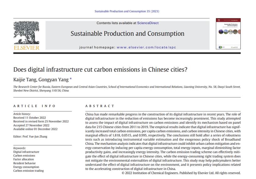 国际经济政治学院杨攻研教授(通讯作者)与其指导的博士生唐凯洁共同完成的学术论文“Does digital infrastructure cut carbon emissions in Chinese cities?”2023年1月在国际期刊Sustainable Production and Consumption发表。