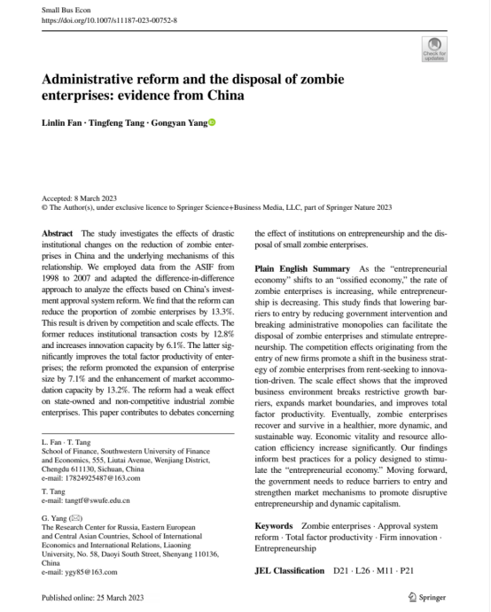 国际经济政治学院杨攻研教授(通讯作者)与合作者共同完成的学术论文Administrative reform and the disposal of zombie enterprises: evidence from China于2023年3月在Small Business Economics发表。