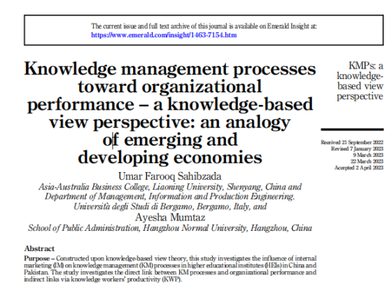 亚澳商学院Umar Farooq Sahibzada副教授的论文“Knowledge Management Processes towards Organizational Performance--A Knowledge-Based View Perspective: An Analogy of Emerging and Developing Economies”,2023年4月在国际期刊Business Process Management Journal发表。