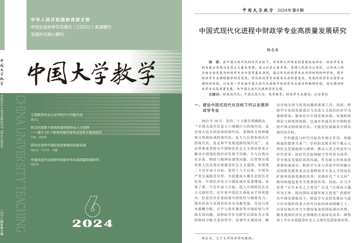 beat365正版唯一官网必一经济学院杨志安教授在《中国大学教学》2024年第6期发表论文《中国式现代化进程中财政学专业高质量发展研究》。
