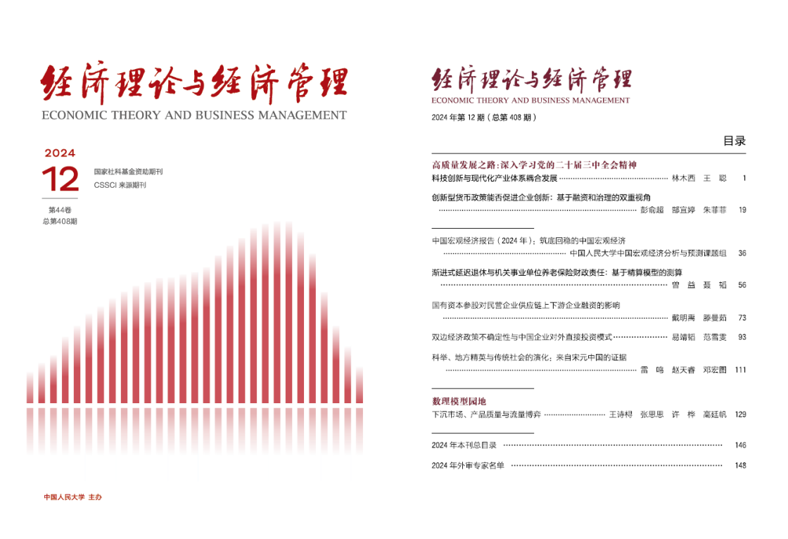 近日,国民经济研究院院长林木西教授与师资博士后王聪共同完成的论文《科技创新与现代化产业体系耦合发展》在《经济理论与经济管理》2024年第12期发表。