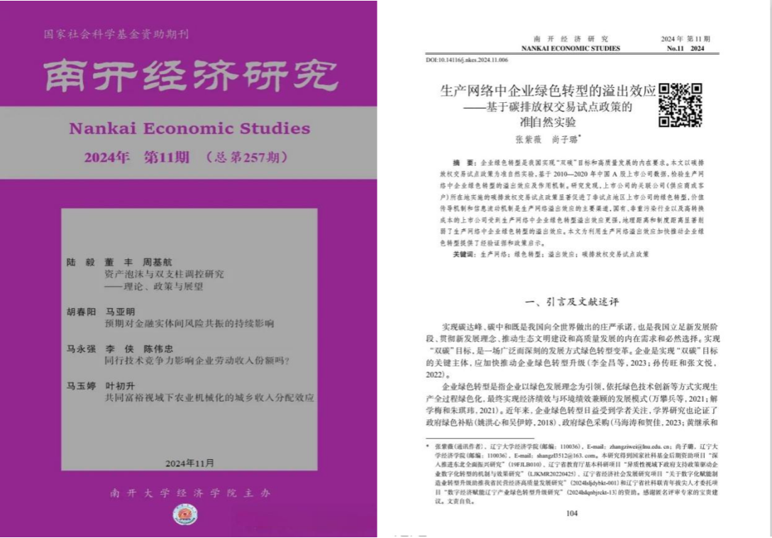近日,经济学院张紫薇副教授与其指导的硕士研究生尚子璐合作论文《生产网络中企业绿色转型的溢出效应——基于碳排放权交易试点政策的准自然实验》在《南开经济研究》2024年第11期发表。