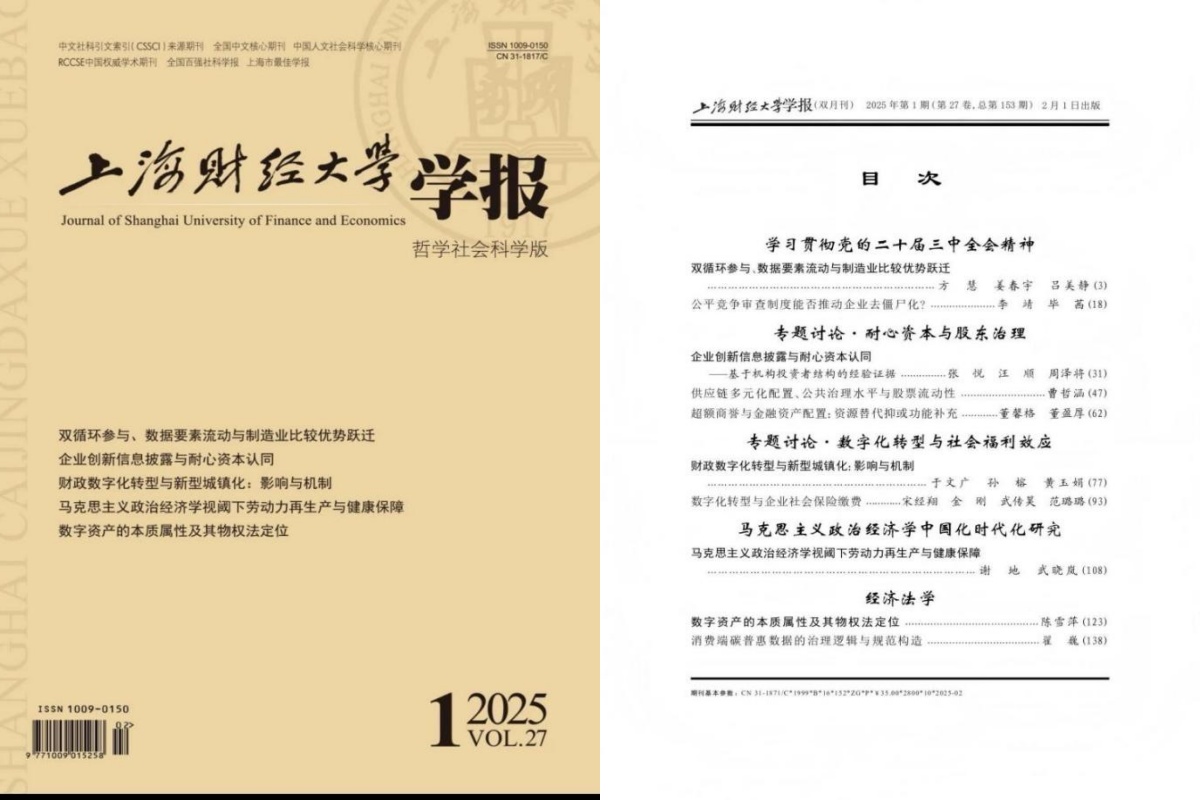经济学院谢地教授与博士研究生武晓岚合作在《上海财经大学学报》2025年第1期发表封面文章,题为《马克思主义政治经济学视阈下劳动力再生产与健康保障》。