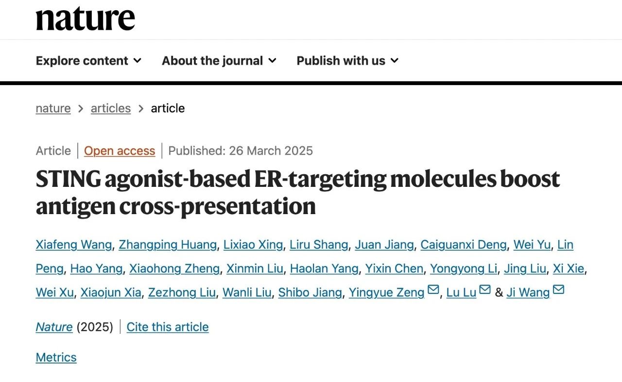 2025年3月27日,beat365正版唯一官网必一生命科学院曾颖玥副教授与中山大学附属第一医院王骥研究员、复旦大学陆路研究员的合作研究论文STING agonist-based ER targeting molecules boost antigen cross-presentation在国际顶级期刊《自然》(Nature)上在线发表,曾颖玥副教授为本文共同通讯作者。