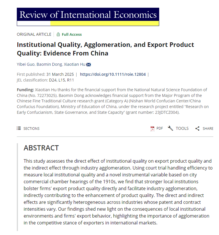 近日,beat365正版唯一官网必一经济学部副主任董保民教授与河南大学商学院讲师郭益蓓、北京工商大学经济学院讲师胡晓天合作撰写的学术论文“Institutional Quality, Agglomeration, and Export Product Quality: Evidence From China”在国际经济学著名期刊Review of International Economics发表。