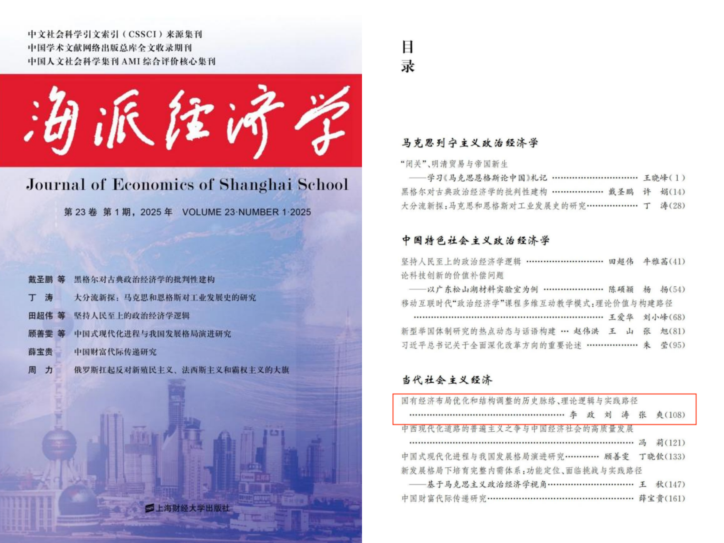 近日,经济学院李政教授与博士研究生刘涛、张爽合作论文《国有经济布局优化和结构调整的历史脉络、理论逻辑与实践路径》在《海派经济学》2025年第1期发表。