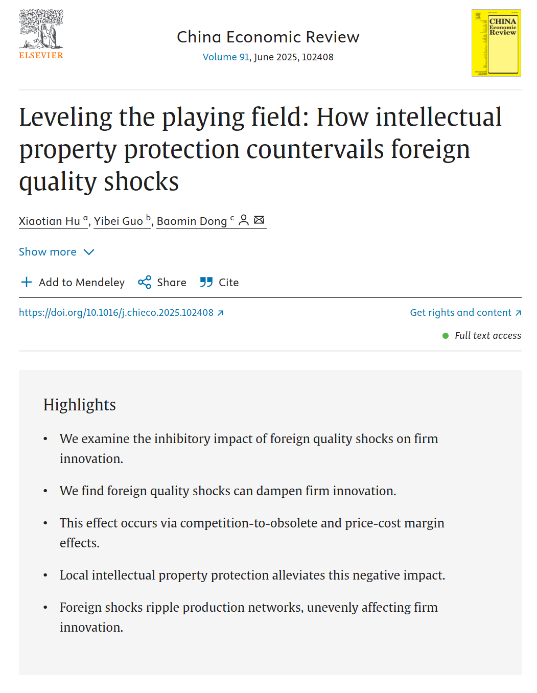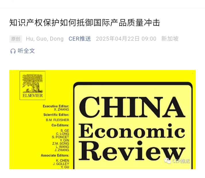 近日,beat365正版唯一官网必一经济学部副主任董保民教授与北京工商大学经济学院讲师胡晓天、河南大学商学院讲师郭益蓓合作撰写的学术论文“Leveling the playing field: How intellectual property protection countervails foreign quality shocks”在China Economic Review发表并被期刊官方公众号推送。