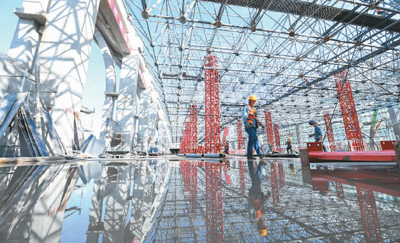 中国最北高铁站——黑龙江伊春西站今年9月完成封顶。该站为哈伊高铁线上站点,线路全线通车后,将加强黑龙江省与内陆发达地区的经济联系,促进东北老工业基地振兴。图为工人在伊春西站施工现场作业。