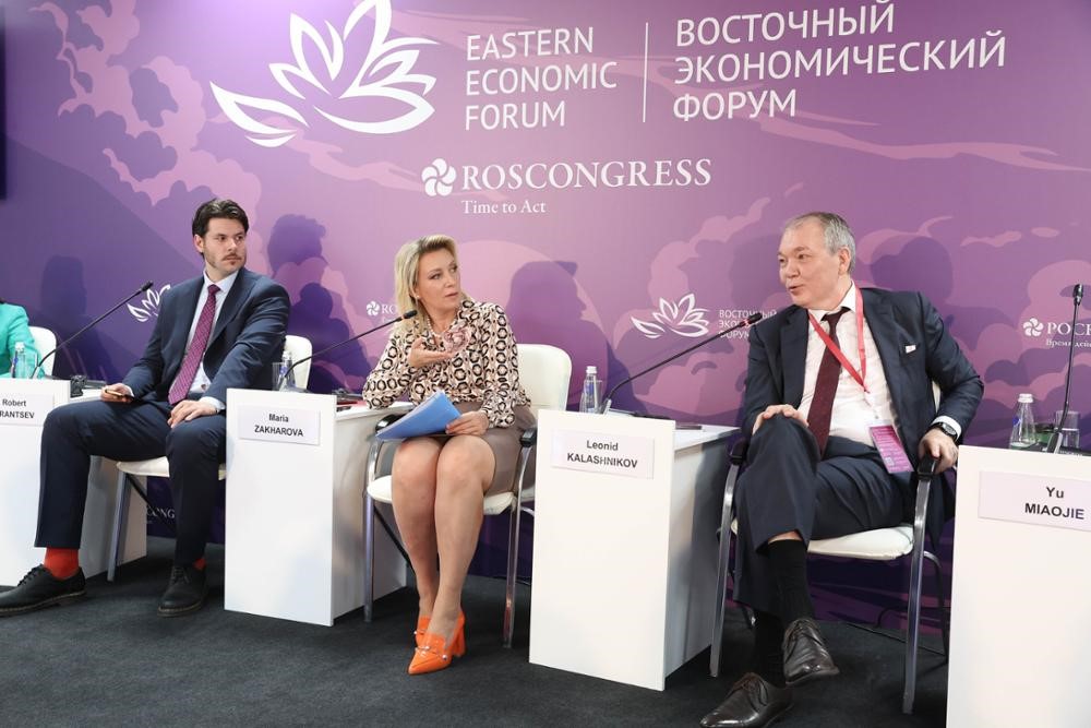 2024年9月6日,余淼杰校长应邀出席了分论坛“欧亚空间:文明与地缘政治的挑战与前景”。该论坛由全俄国家电视广播公司中亚局局长、《亚洲中心》节目主持人罗伯特・弗兰采夫主持。发言嘉宾还包括俄罗斯联邦外交部信息与出版司司长玛丽亚・扎哈罗娃,俄罗斯联邦国家杜马独联体事务、欧亚一体化和与同胞关系委员会主席列昂尼德・卡拉什尼科夫,欧亚经济委员会工业和农工综合体部长高哈尔・巴塞吉安,俄罗斯联邦经济发展部副部长德米特里・沃尔瓦奇。