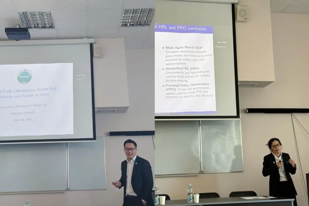 在“亚洲和拉丁美洲的经济转型”分论坛,王丹丹向与会者介绍了她与余淼杰的合作论文《贸易的权力游戏:多层政府及异质性企业》。她指出在全球化背景下国际贸易动态日益复杂,传统经济模型难以全面捕捉较为完整的政府结构、企业异质性和战略政策互动。为此,她提出了一个创新的方法论框架,并且将多智能体强化学习技术与经济建模相结合。她在报告中详细阐述了模型的关键特征,包括出口国的政府结构、企业生产力的帕累托分布、内生产能利用率,以及各方的战略政策互动。这一模型利用强化学习算法模拟了政府和企业在动态贸易环境中的适应性行为和策略选择。模型特别揭示了政府之间的协调如何影响补贴效率,这一发现对于理解完整政府结构下的政策制定具有重要意义,为政策制定者提供了新的分析工具。