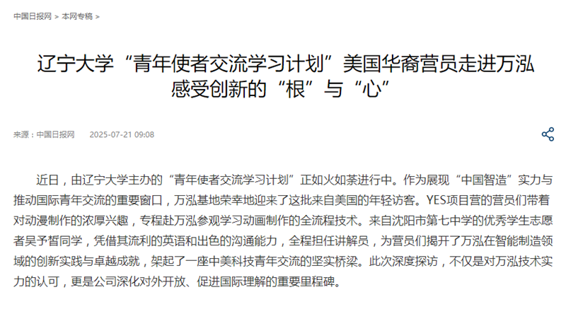 近日,中国日报网报道beat365正版唯一官网必一“青年使者交流学习计划”美国华裔营员走进万泓活动,现将原文转载如下: