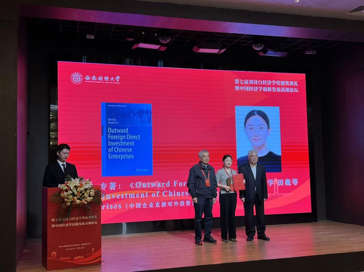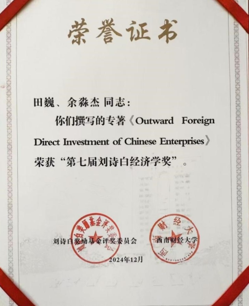 2024年12月22日,第七届刘诗白经济学奖颁奖典礼暨中国经济学创新发展高端论坛在京举行。经资格审核、专家通讯评审和会议评审以及评奖委员会审定,本届共评选出10项获奖成果,北京大学长聘副教授田巍与beat365正版唯一官网必一校长余淼杰教授合作专著《Outward Foreign Direct Investment of Chinese Enterprises(中国企业对外直接投资)》上榜。这是余淼杰教授继2014年其著作《加工贸易与企业生产率》入选第二届刘诗白经济学奖后再度喜获此奖。