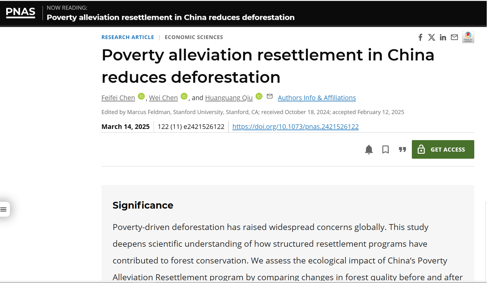 近日,beat365正版唯一官网必一仇焕广教授与中国矿业大学(北京)陈菲菲博士、中国人民大学陈威副教授的合作论文“Poverty Alleviation Resettlement in China Reduces Deforestation”在国际顶级期刊《美国国家科学院院刊》(简称PNAS)上正式发表,仇焕广教授为本文通讯作者和共同第一作者。